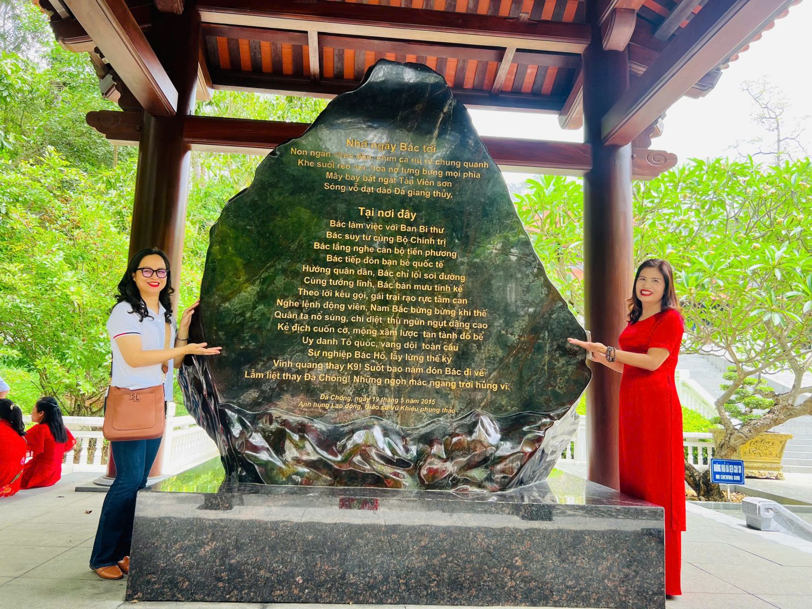 Tập thể giáo viên hai nhà trường chụp ảnh lưu niệm tại Nhà tưởng niệm Chủ tịch Hồ Chí Minh tại Khu di tích K9 Đá Chông.