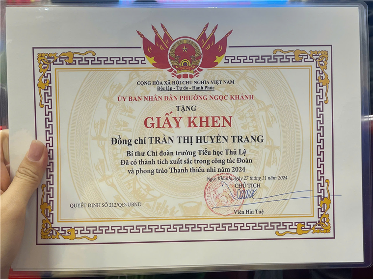 Giấy khen của cô giáo Trần Thị Huyền Trang – Bí thư Chi đoàn trường Tiểu học Thủ Lệ
