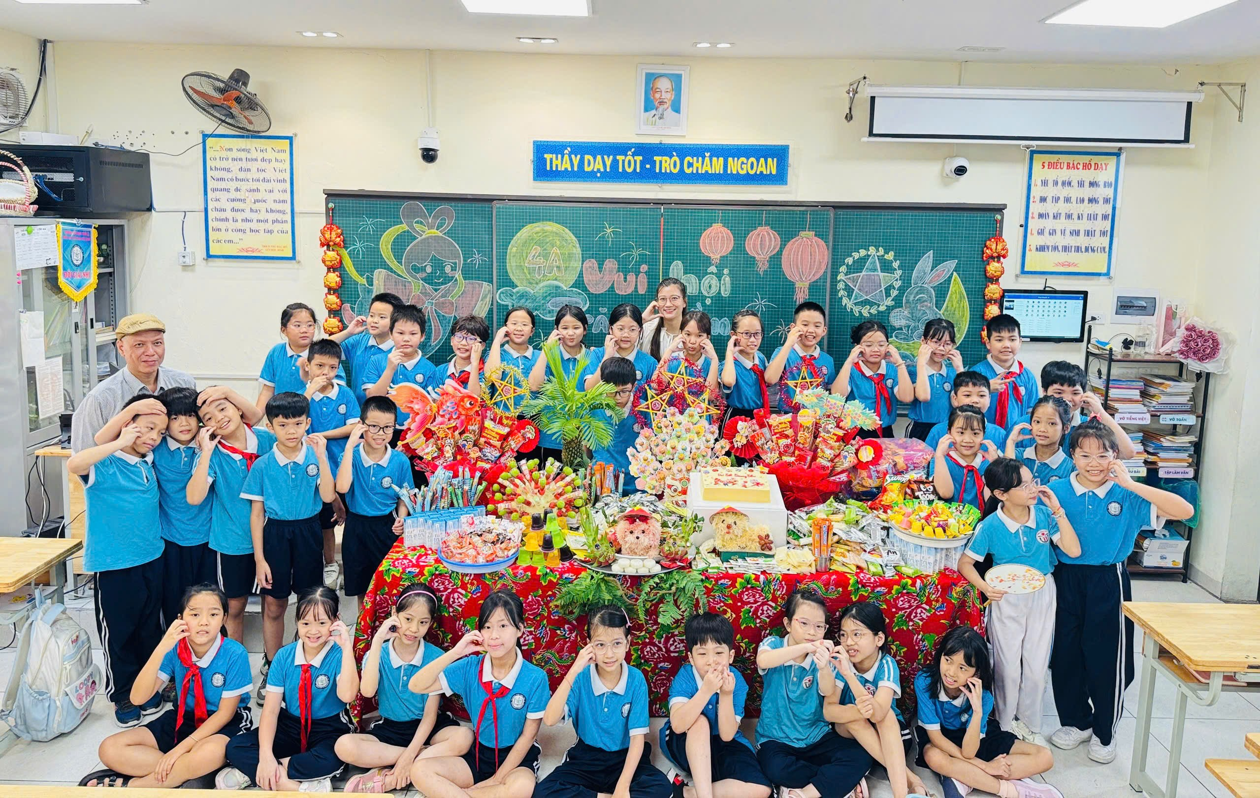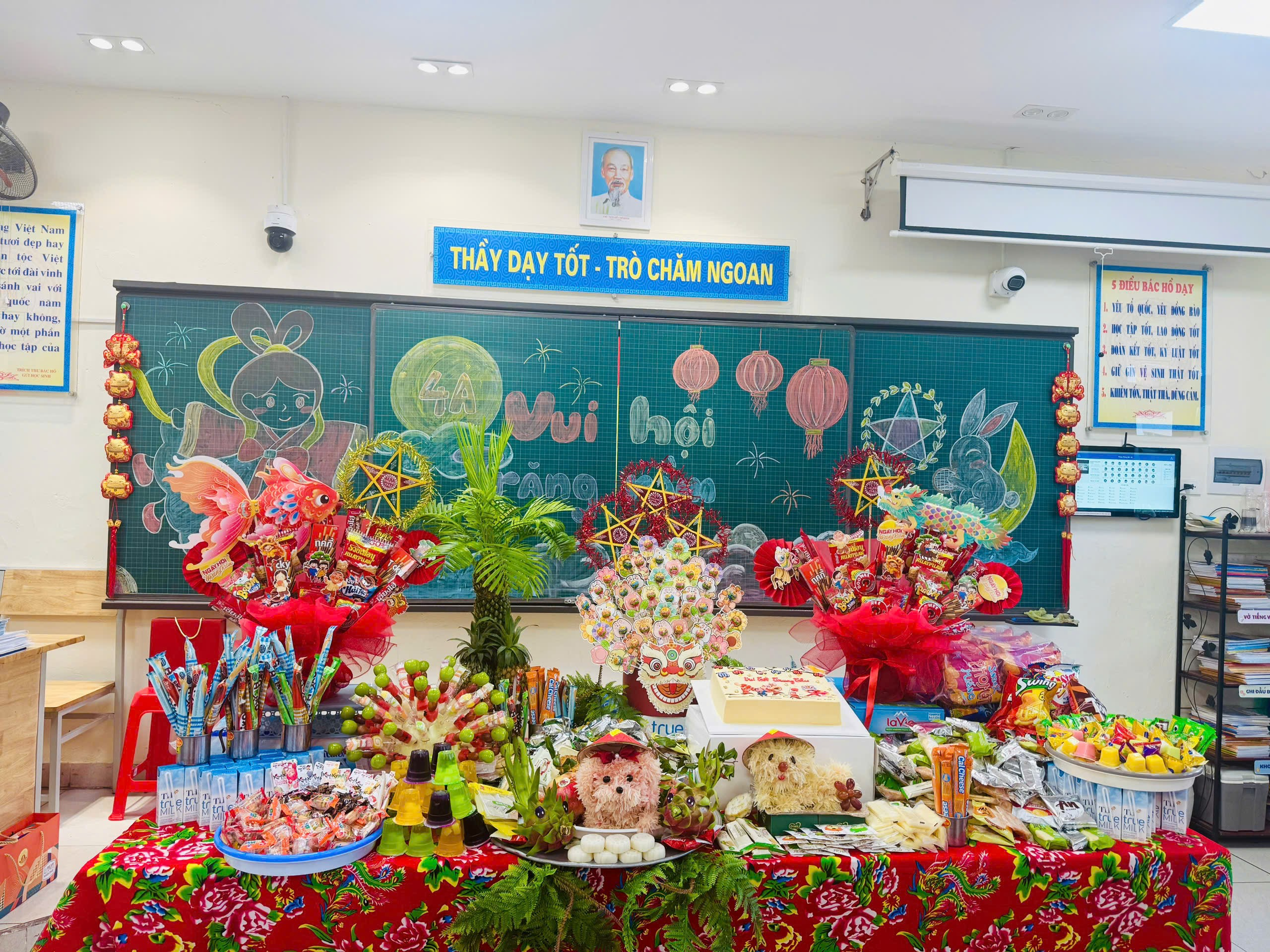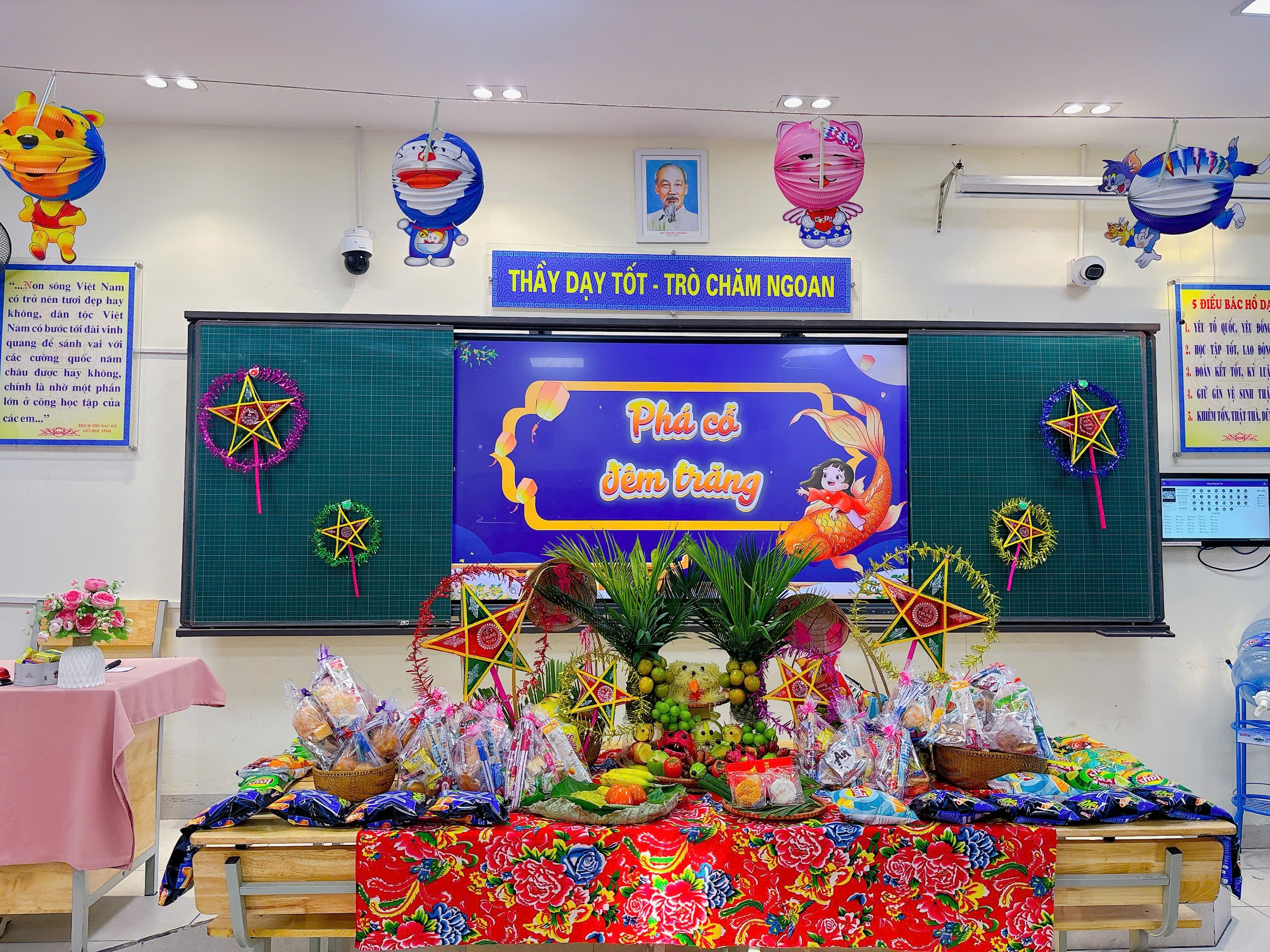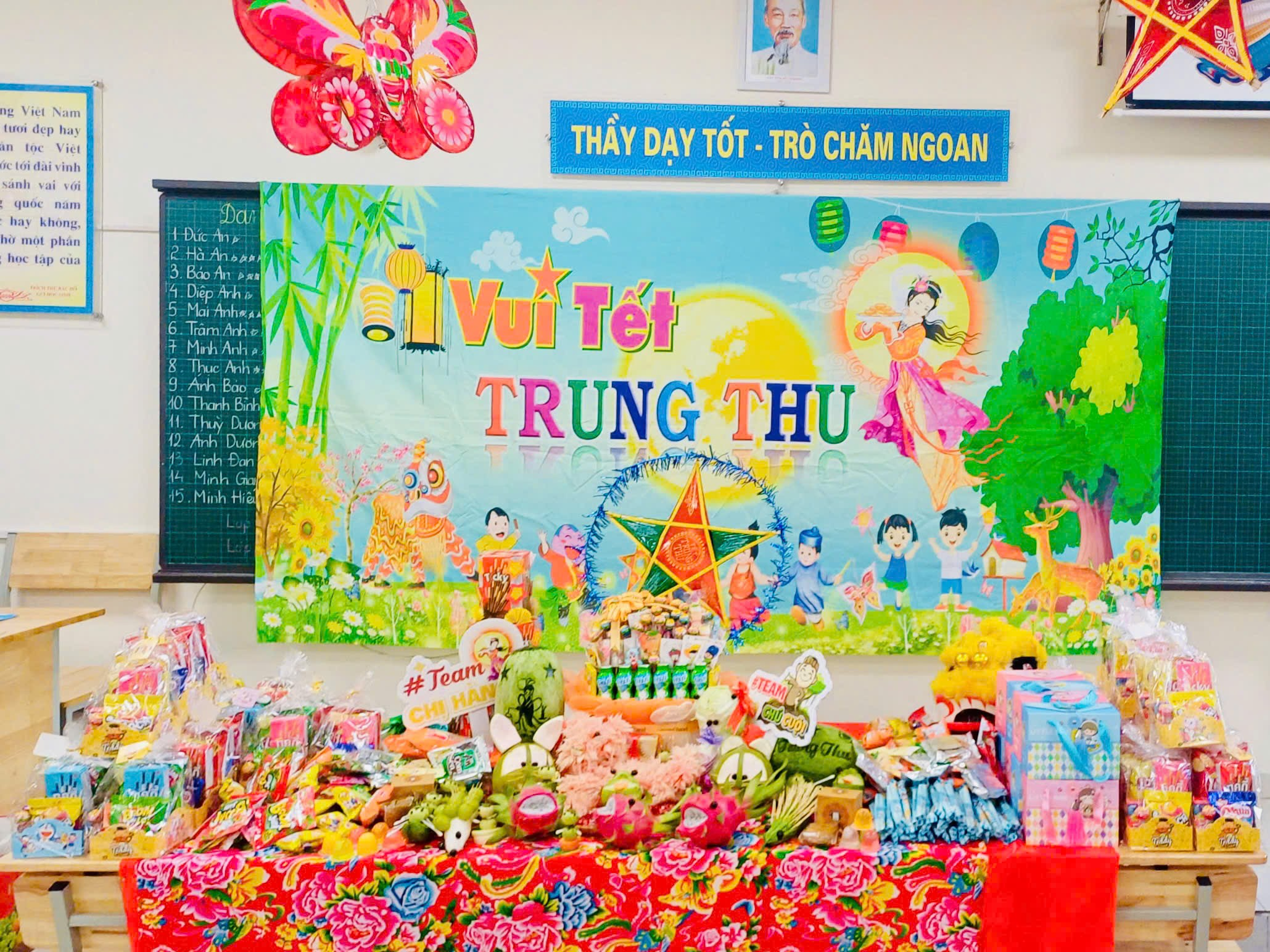 Ngay từ sáng sớm, sân trường đã ngập tràn không khí náo nhiệt. Những chiếc đèn ông sao, đèn cá chép rực rỡ, những mâm ngũ quả được các lớp trang trí tỉ mỉ, thể hiện sự khéo léo và sáng tạo của học sinh. Mỗi lớp mang đến một sắc màu riêng, tạo nên bức tranh Trung thu đầy sinh động.