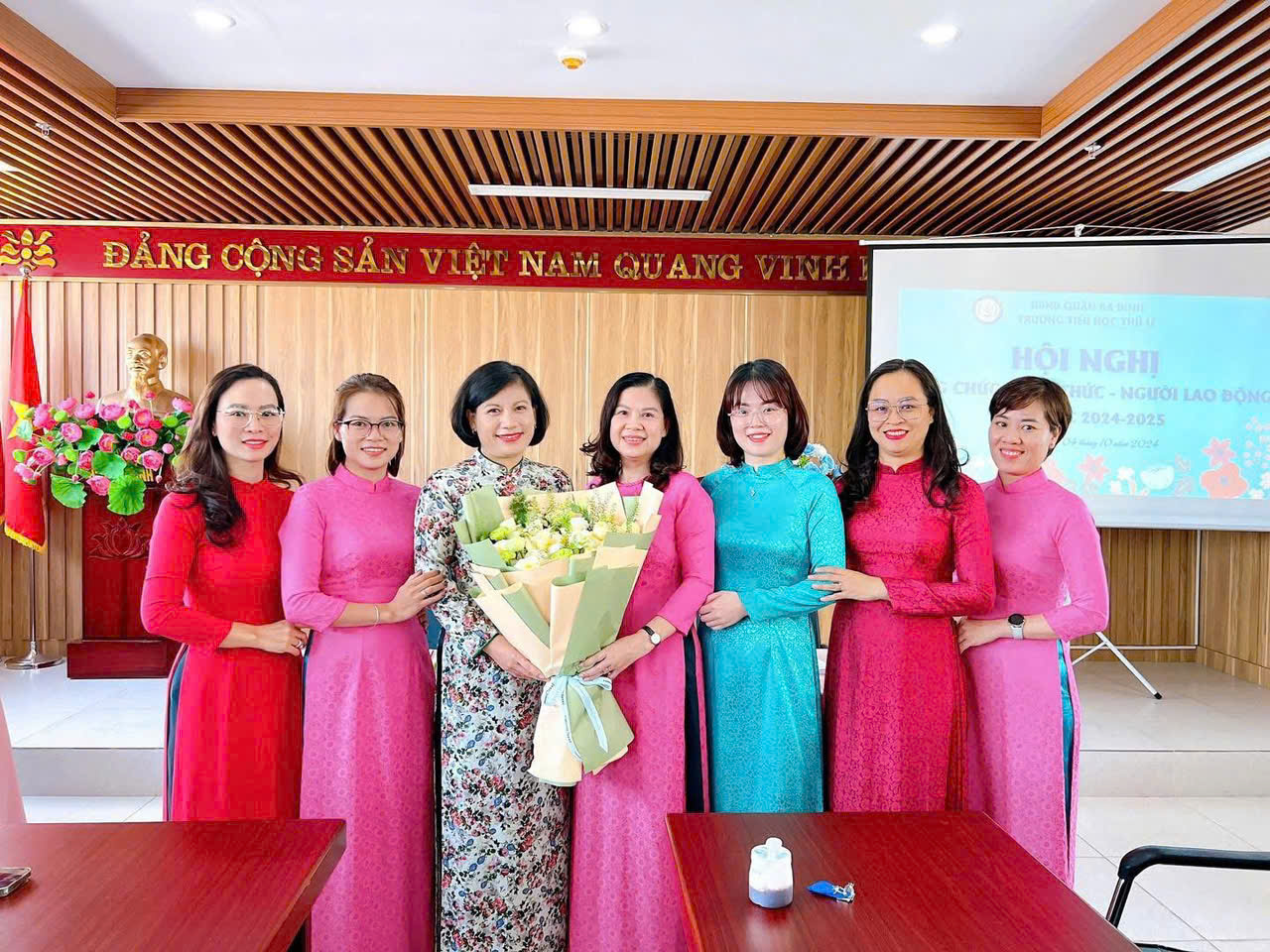 Cô giáo Trần Hồng Hạnh – Chủ tịch công đoàn cùng BGH nhà trường tặng hoa chúc mừng Hội nghi Công chức viên chức người lao động