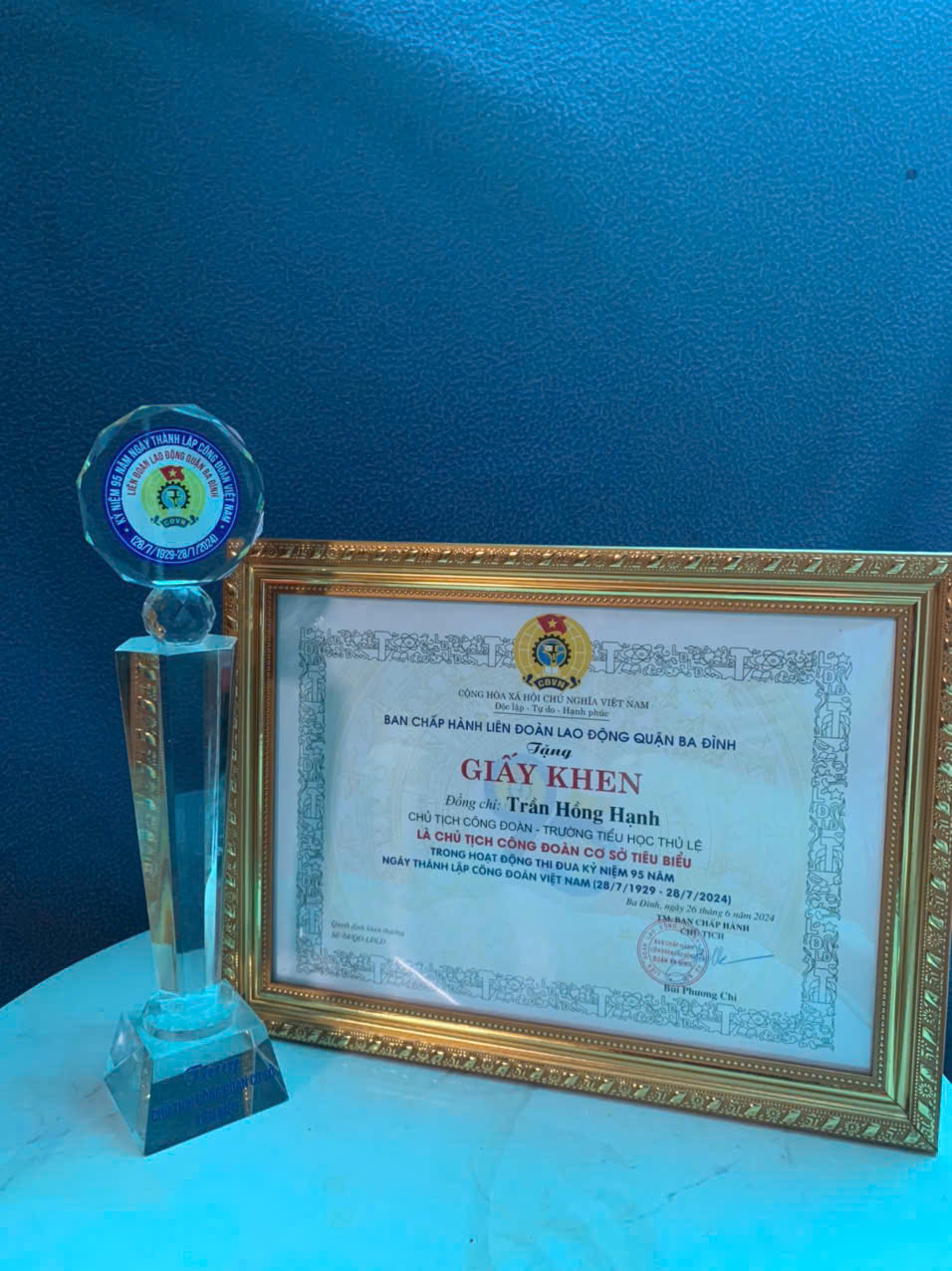 Cô Trần Hồng Hạnh vinh dự được nhận giấy khen và cúp do LĐLĐ quận khen CTCĐ cơ sở tiêu biểu vào năm 2024