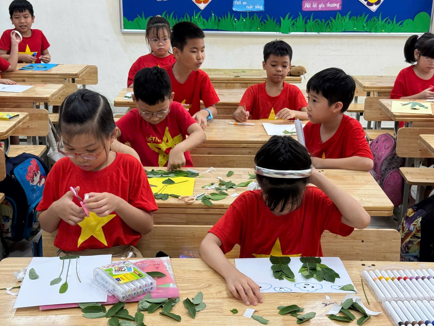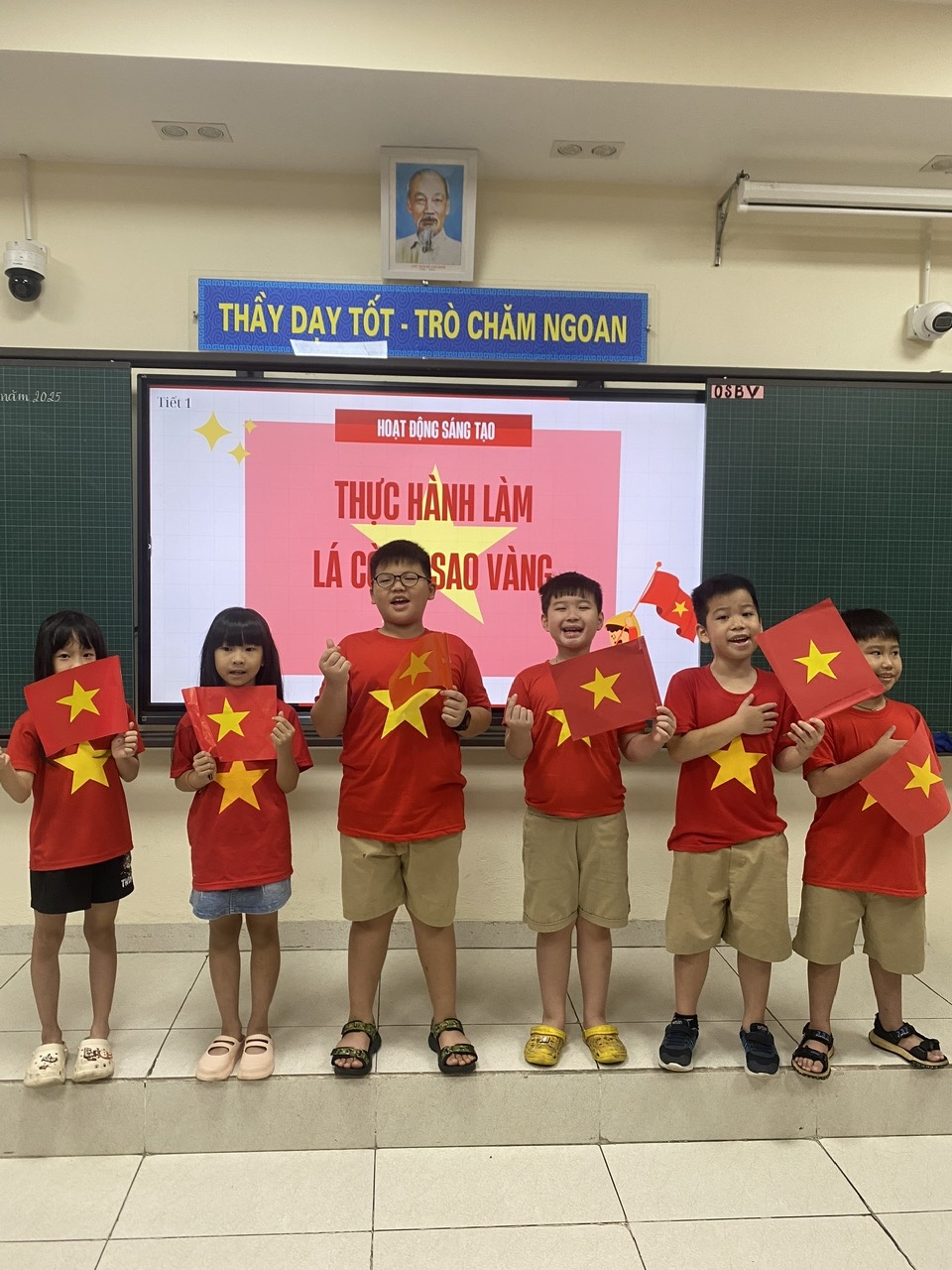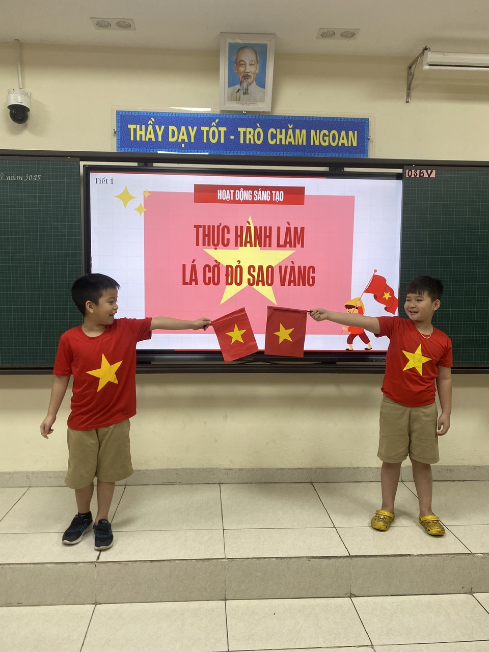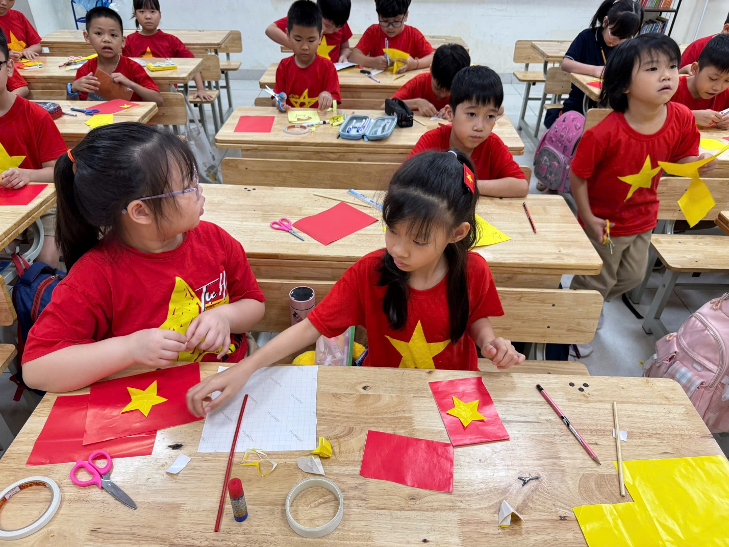 Các em học sinh say sưa thực hành làm lá cờ Tổ quốc bằng giấy màu. Từng đường gấp, nét dán tuy nhỏ bé nhưng chứa đựng trong đó niềm tự hào dân tộc, tình yêu quê hương đất nước. Thành phẩm là những lá cờ đỏ tươi thắm, ngôi sao vàng rực rỡ – biểu tượng thiêng liêng của dân tộc Việt Nam.
