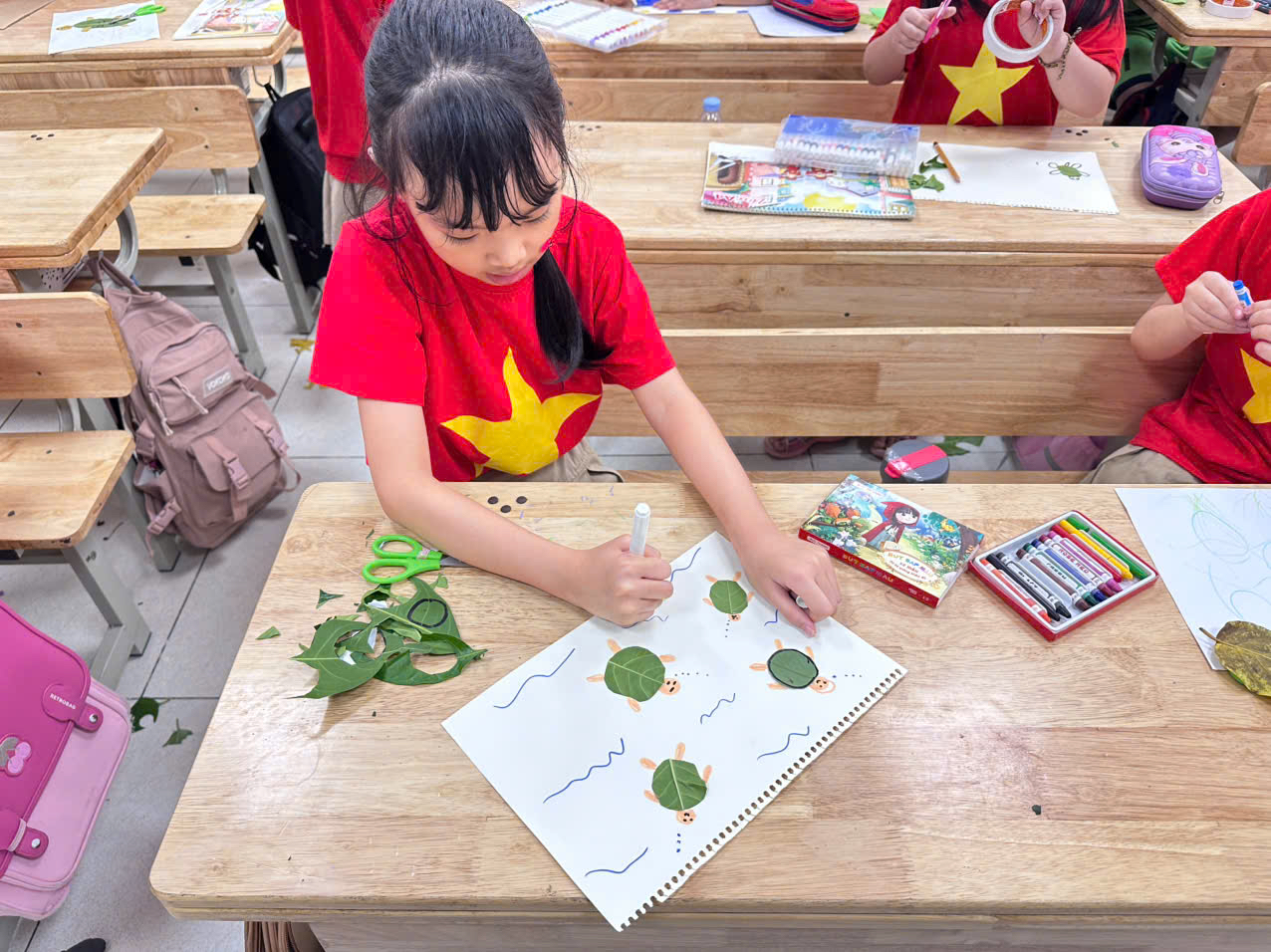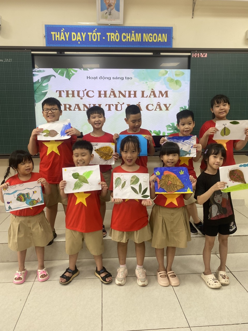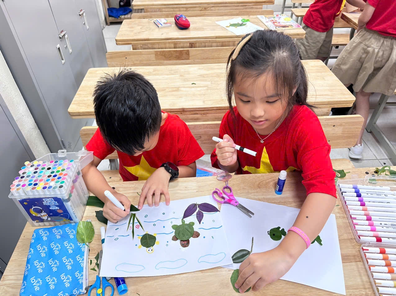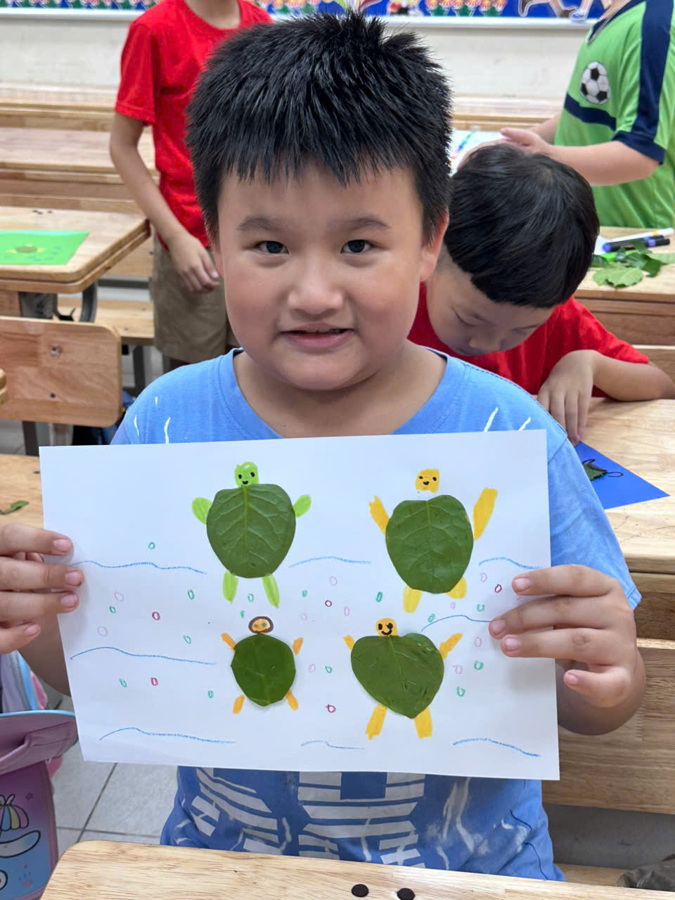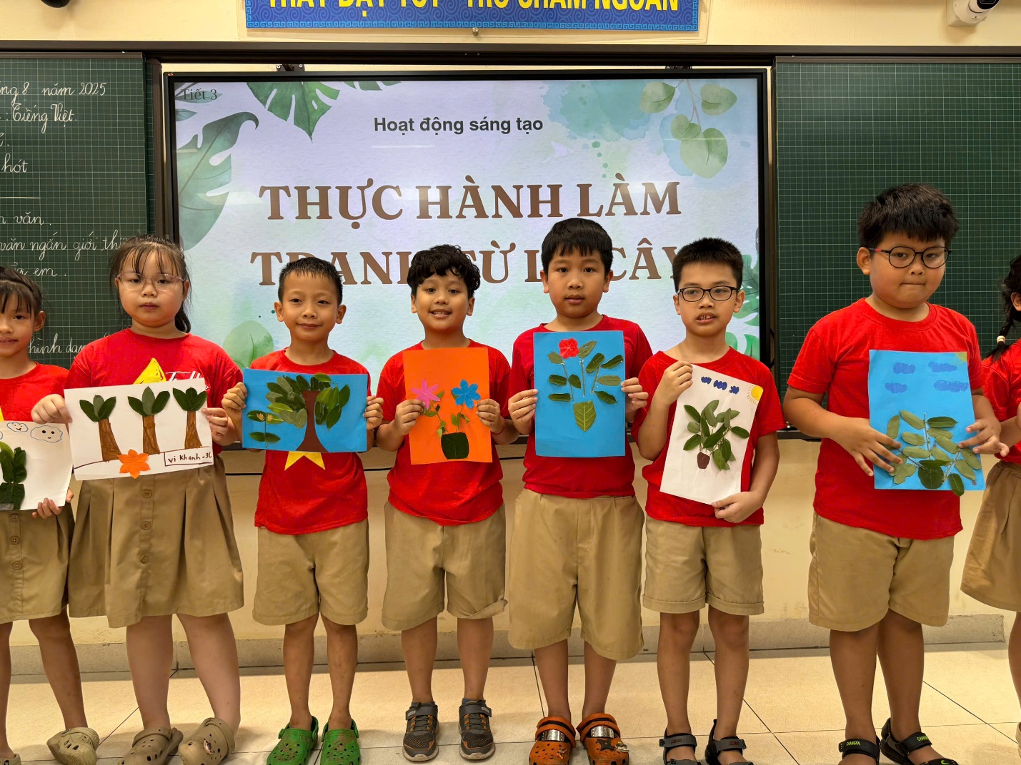 Với mong muốn khơi dậy tư duy sáng tạo và tình yêu thiên nhiên cho học sinh, các bạn đã có một buổi học đầy hứng khởi với chủ đề “Làm tranh từ lá cây”. Tận dụng những chiếc lá khô nhặt trong sân trường, các em đã biến chúng thành những bức tranh độc đáo và đầy màu sắc, ngộ nghĩnh.