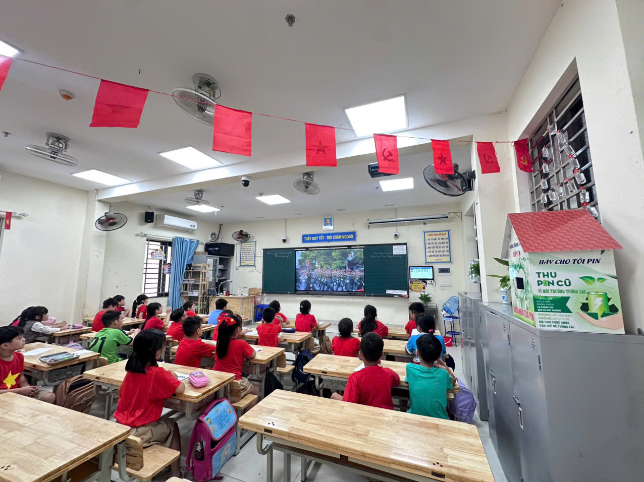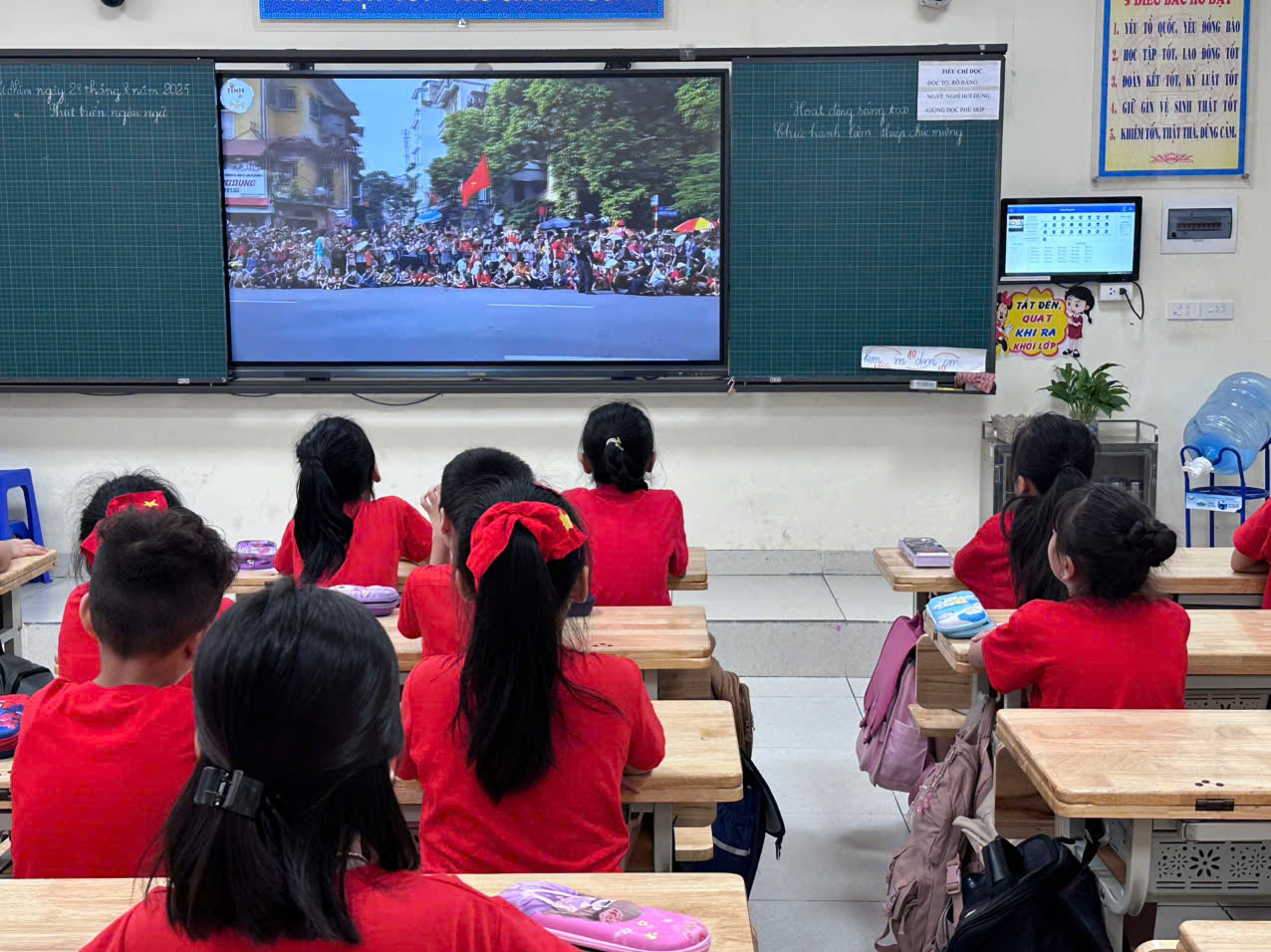Bên cạnh hoạt động sáng tạo và khoa học, các em còn được tìm hiểu về ý nghĩa lịch sử trọng đại của Cách mạng Tháng Tám 1945 và ngày Quốc khánh 2/9. Qua vi deo và lời kể của thầy cô, học sinh hiểu thêm về tinh thần đấu tranh kiên cường của dân tộc, từ đó nuôi dưỡng niềm tự hào và ý thức trách nhiệm giữ gìn, phát huy truyền thống cha ông.