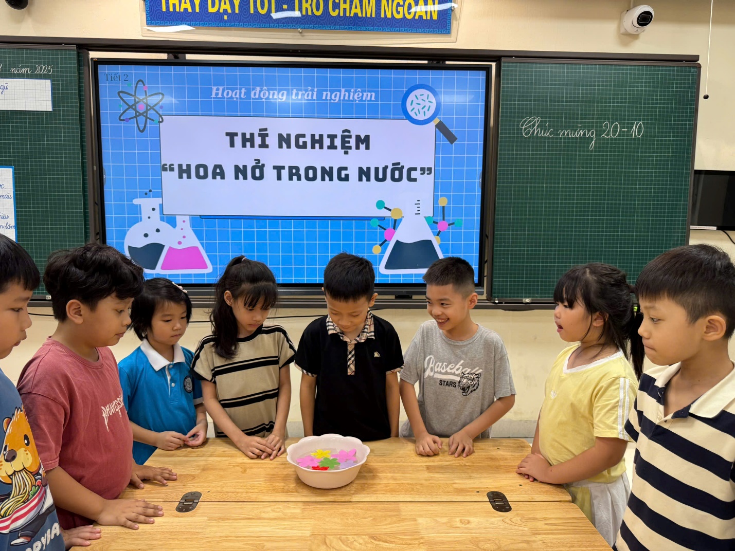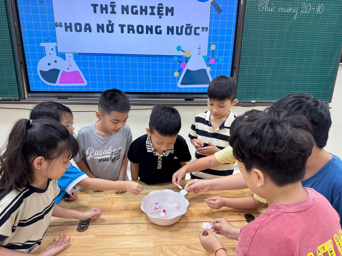 Với giấy cắt thành hình bông hoa gấp khép lại, khi thả xuống mặt nước, những cánh hoa từ từ nở bung ra. Các em vô cùng thích thú khi được trực tiếp quan sát hiện tượng và hiểu thêm về sự thẩm thấu cũng như những điều kỳ diệu của tự nhiên.