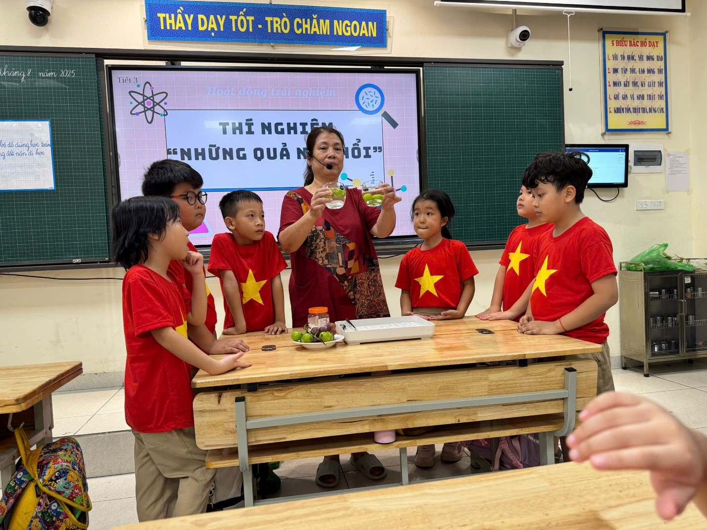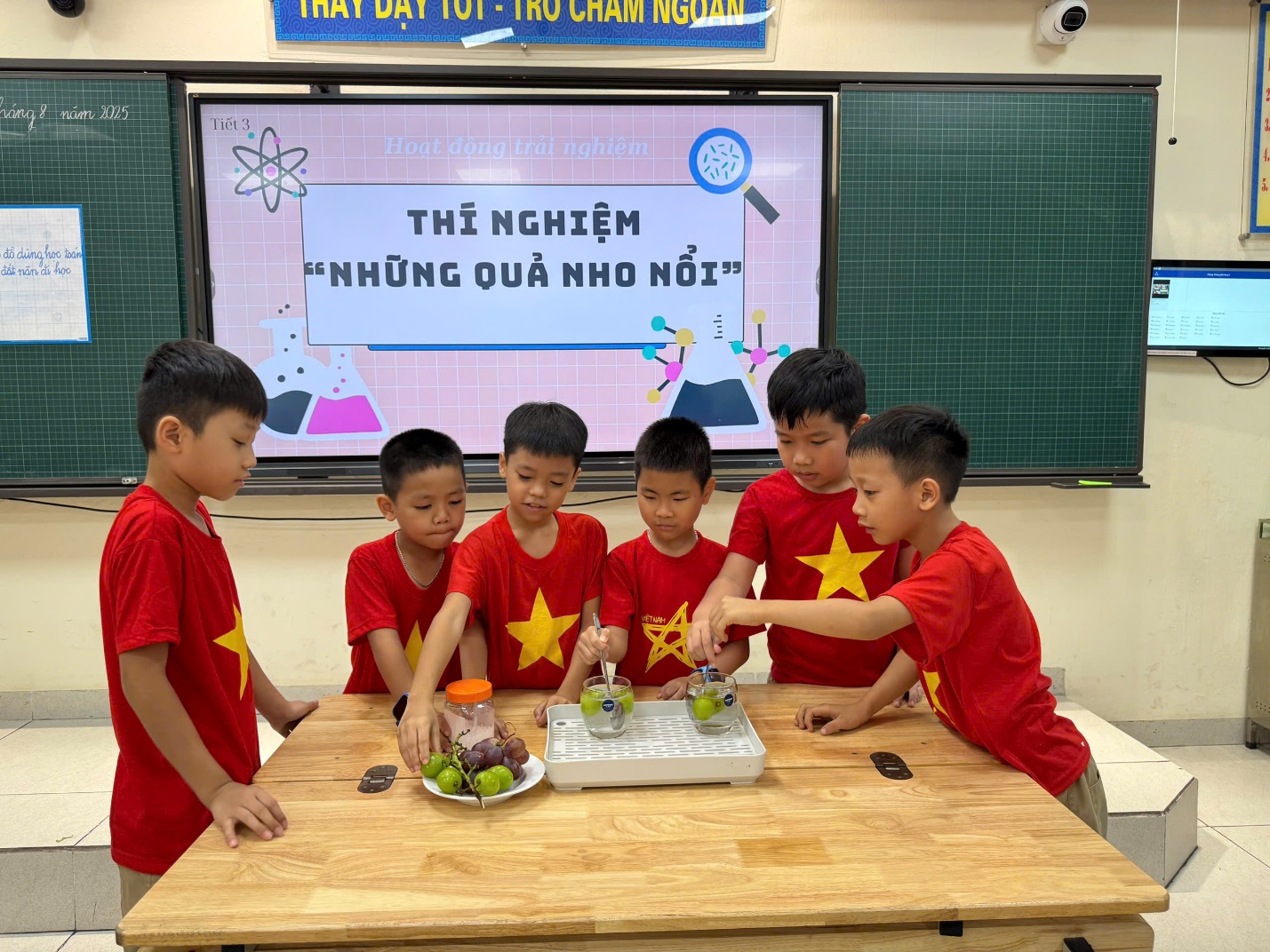 Các em hào hứng thả từng quả nho vào cốc nước có muối. Điều bất ngờ là những quả nho không chìm hẳn mà lại “nhảy múa” lên xuống. Qua đó, học sinh được rèn kỹ năng quan sát, tìm hiểu nguyên nhân khoa học đằng sau hiện tượng thú vị này.