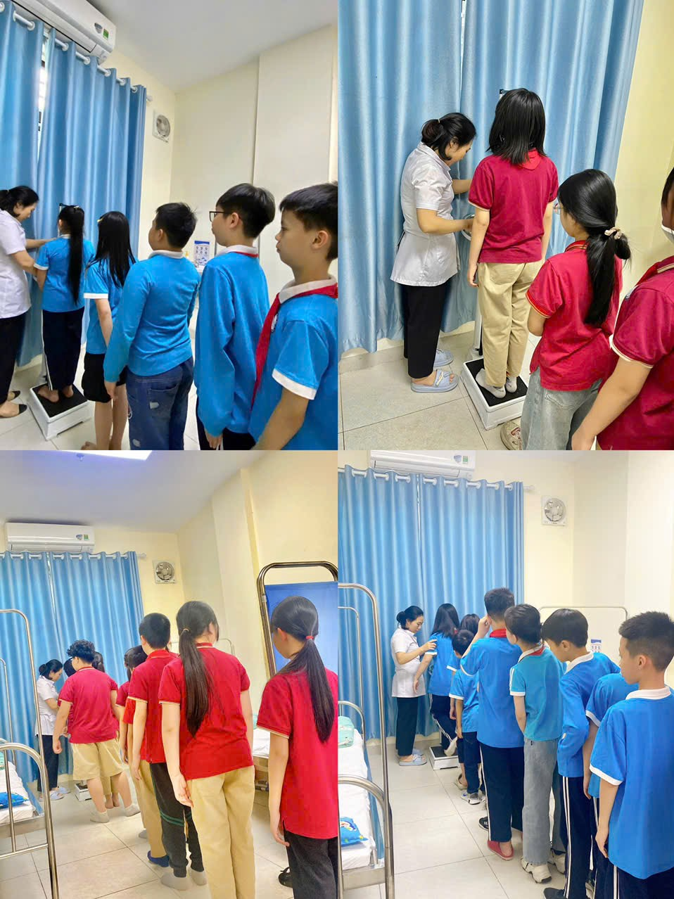 Các bạn nhỏ khối 4 đang xếp hàng đo cân nặng, chiều cao