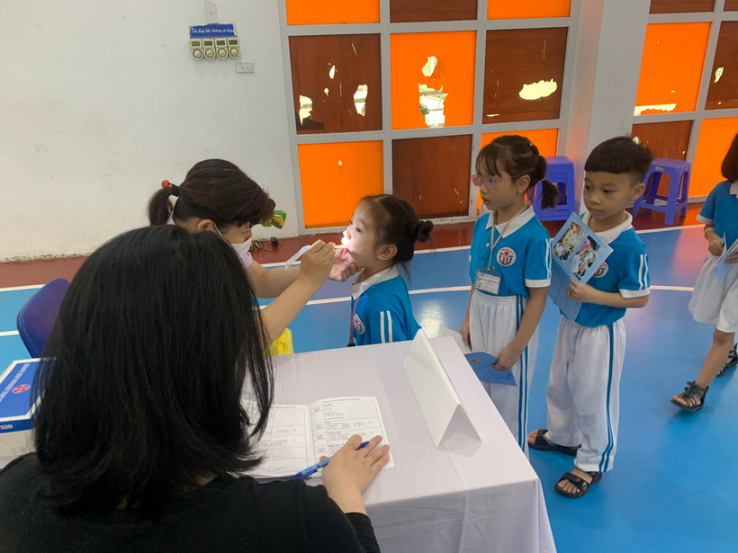 Học sinh được các cô giáo hướng dẫn qua các bàn khám