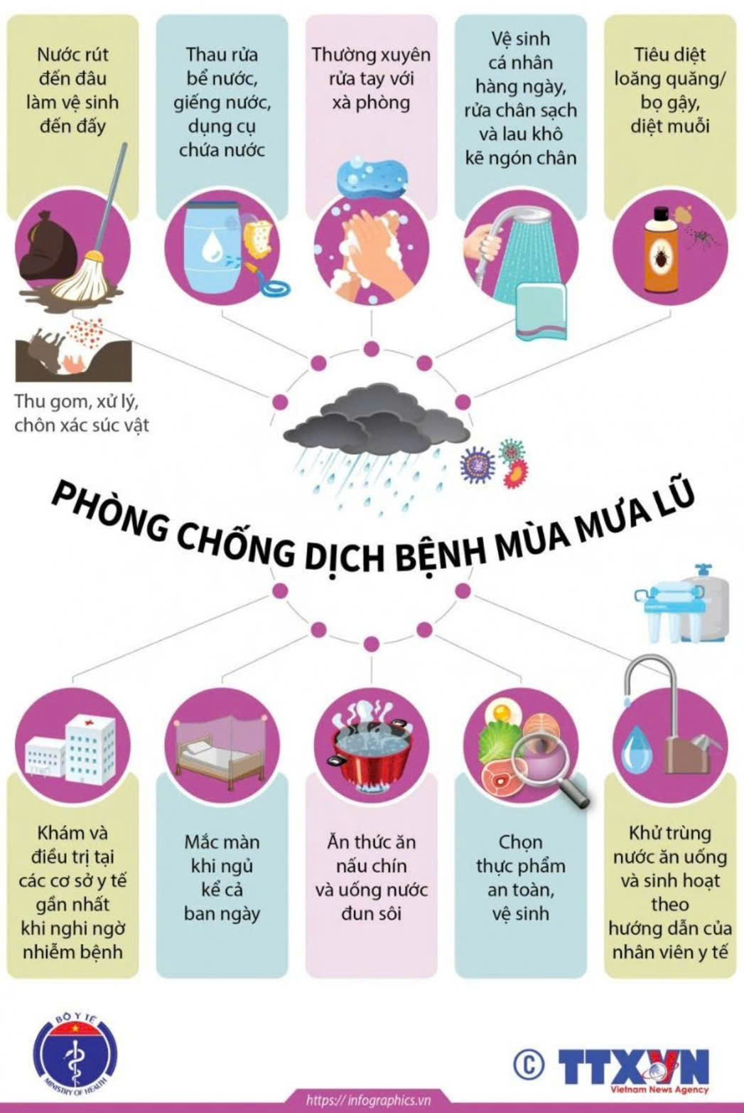 8. Xử trí khi nghi ngờ mắc bệnh truyền nhiễm. Trong thời gian sau mưa bão, nếu có các triệu chứng như có sốt, đau mắt, tiêu chảy, phát ban hoặc bất kỳ biểu hiện bất thường nào, cần đến ngay cơ sở y tế gần nhất để được khám và điều trị kịp thời.