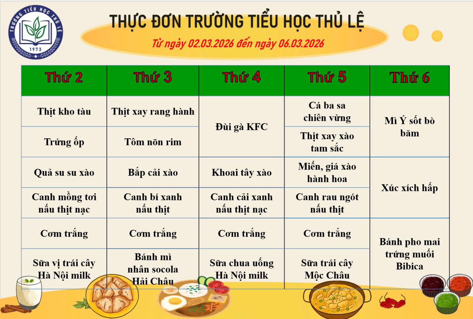 Nhà trường gửi tới các bậc PH và các con HS thực đơn tuần 1 tháng 3/2026. Trân trọng!