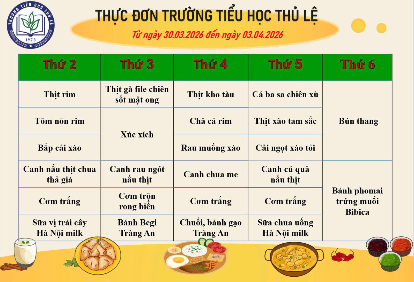 Nhà trường gửi tới các bậc PH và các con HS thực đơn tuần 1 tháng 4/2026. Trân trọng!