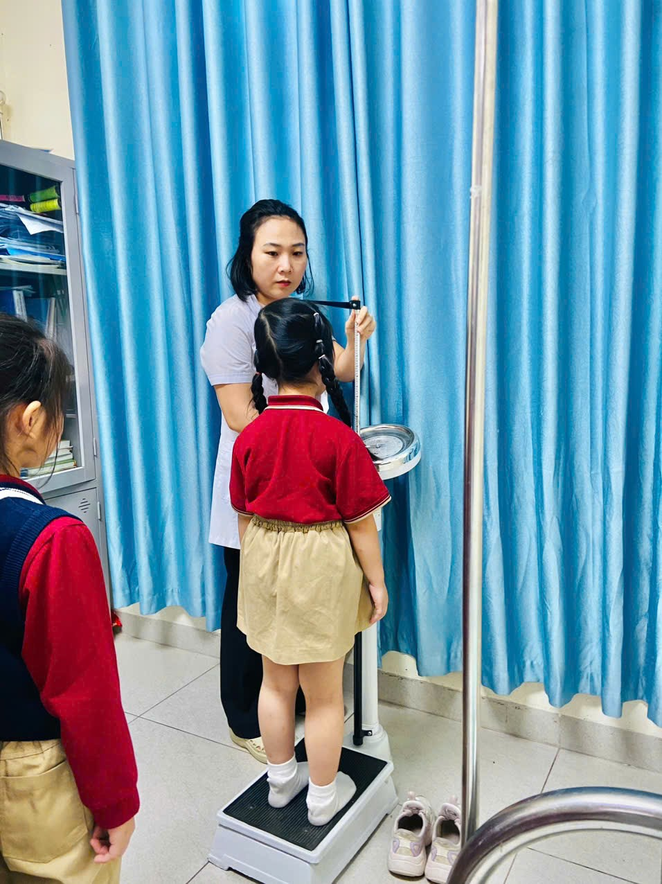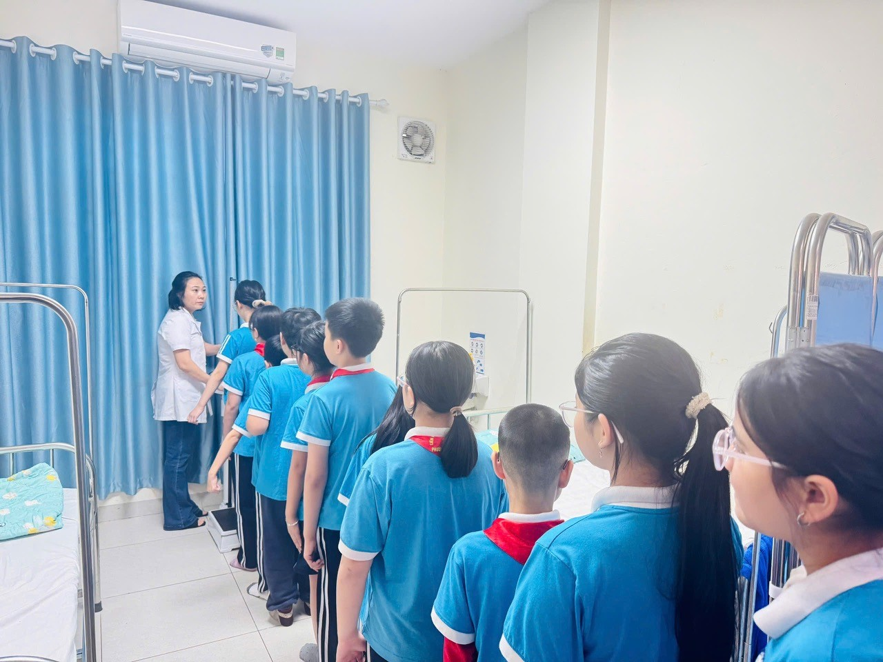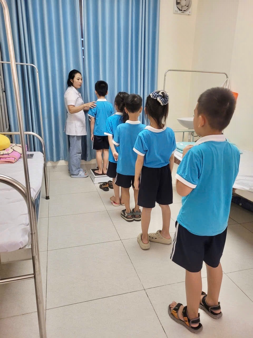 Các bạn nhỏ khối 4 đang xếp hàng đo cân nặng, chiều cao