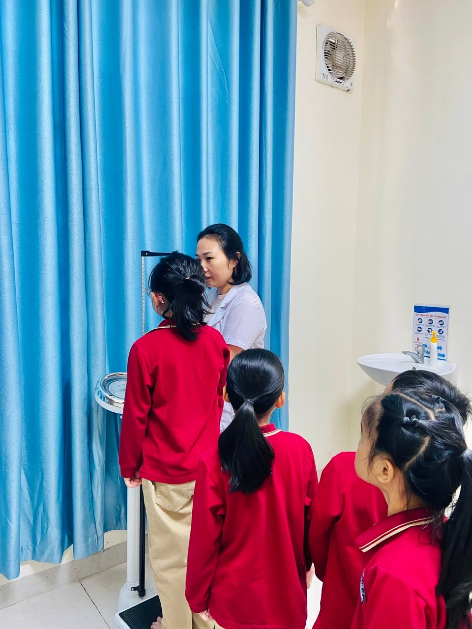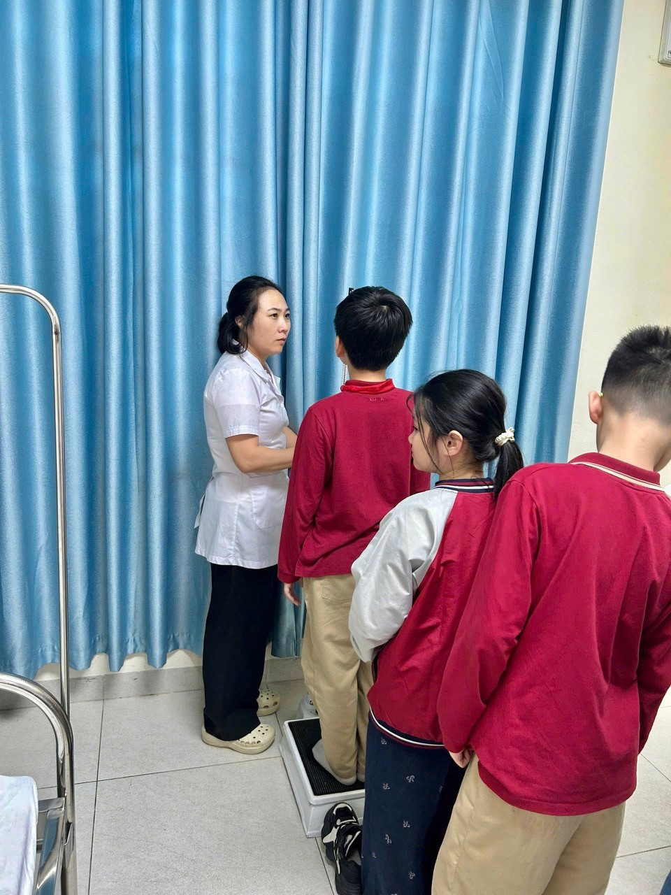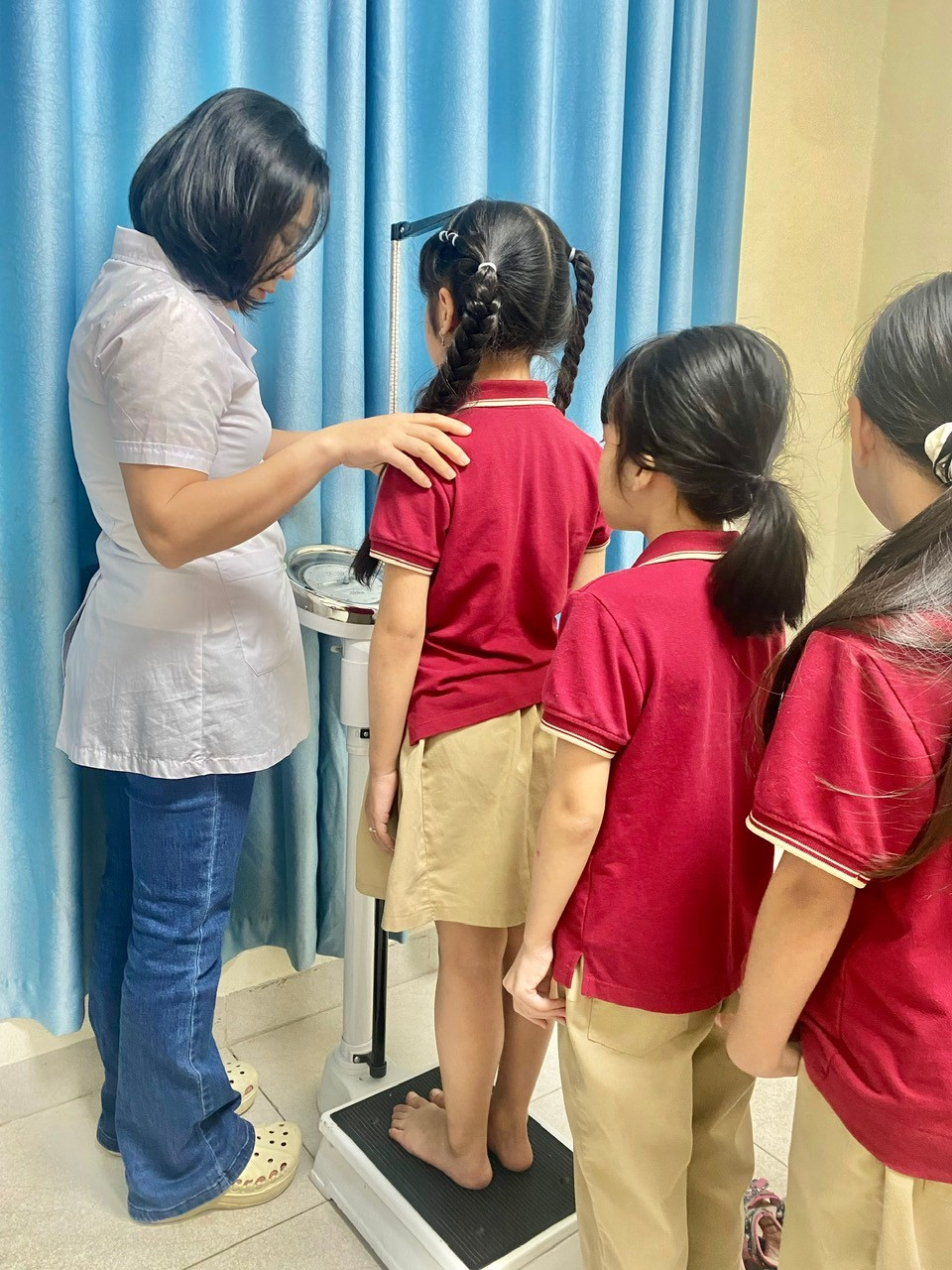 Các bạn nhỏ khối 4 đang xếp hàng đo cân nặng, chiều cao