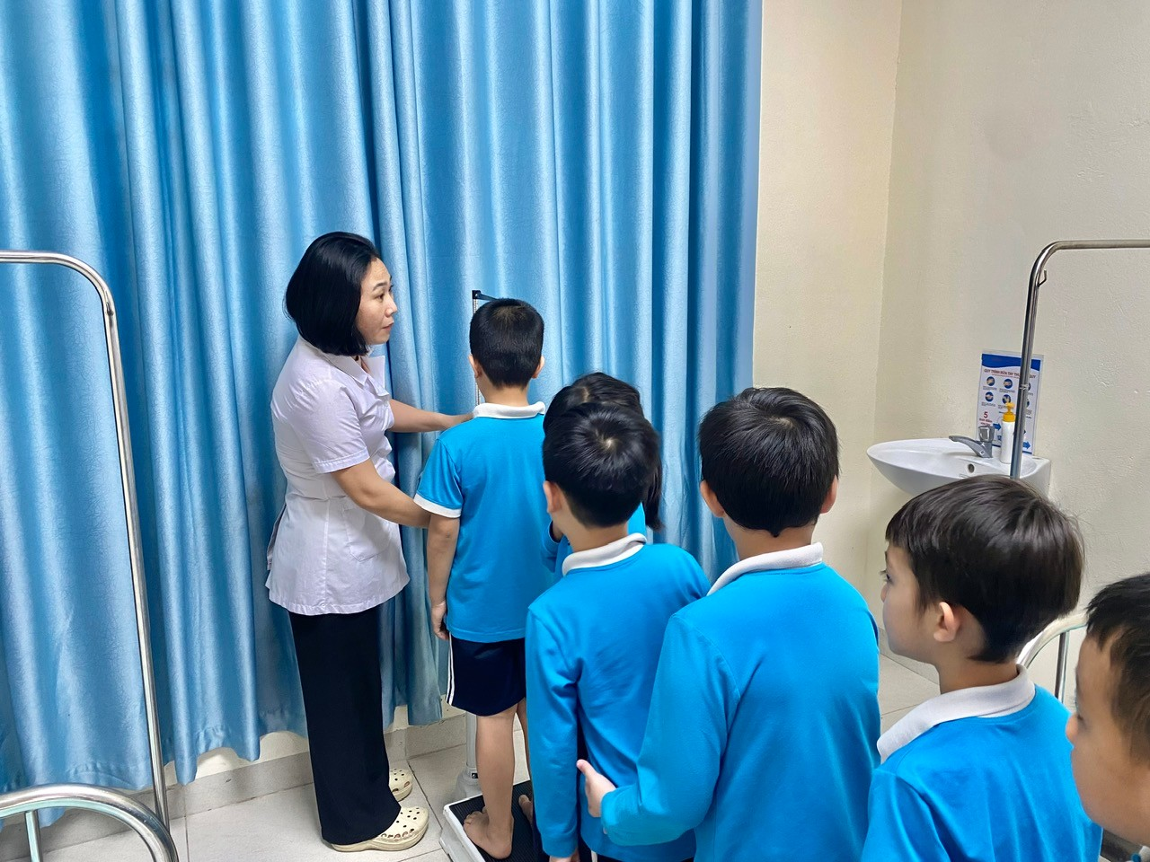 Các bạn nhỏ khối 5 đang xếp hàng đo cân nặng, chiều cao